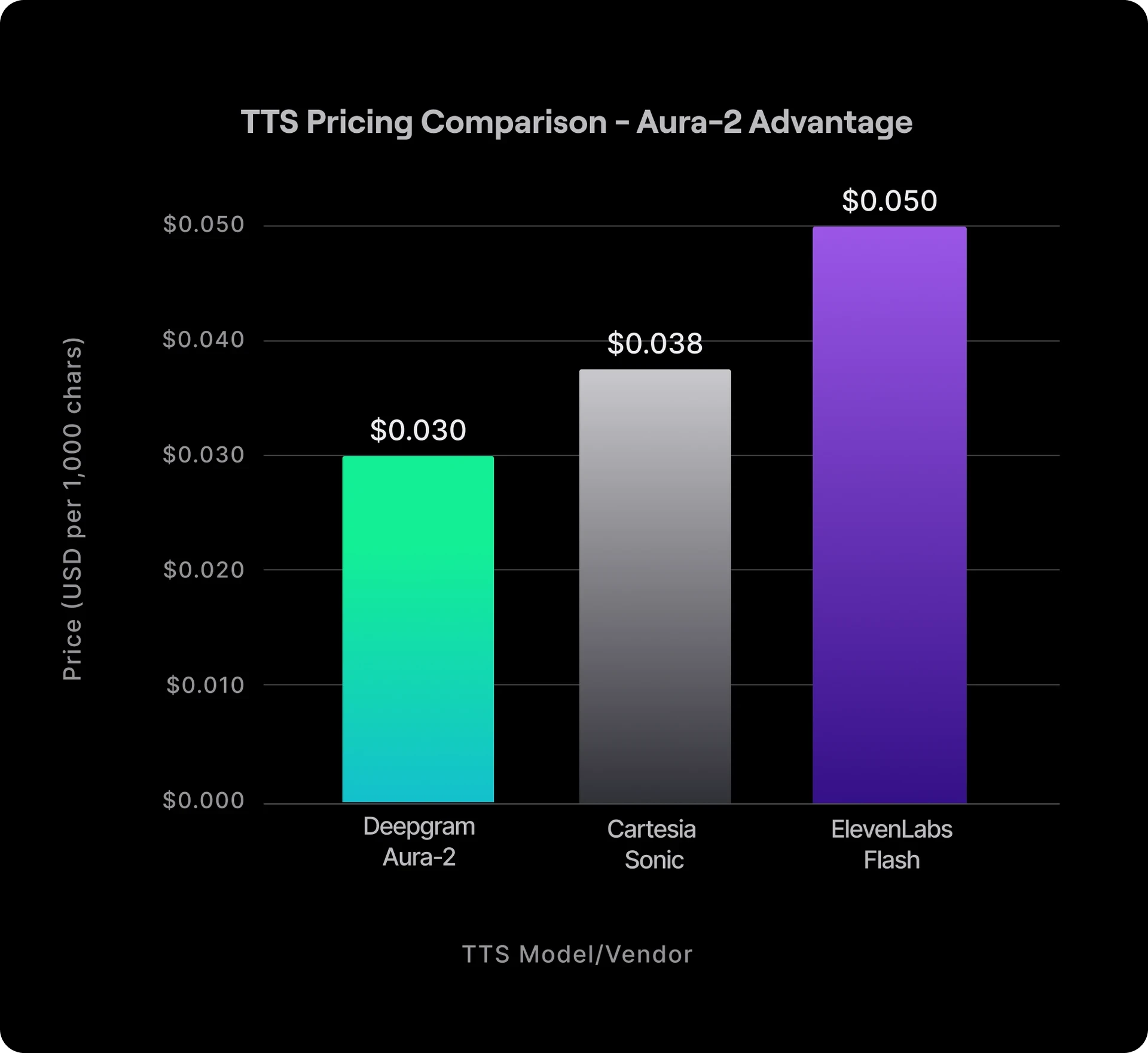 Deepgram Aura-2 delivers faster time-to-first-byte (TTFB) than ElevenLabs. Lower latency means your applications respond quicker and conversations feel more natural.