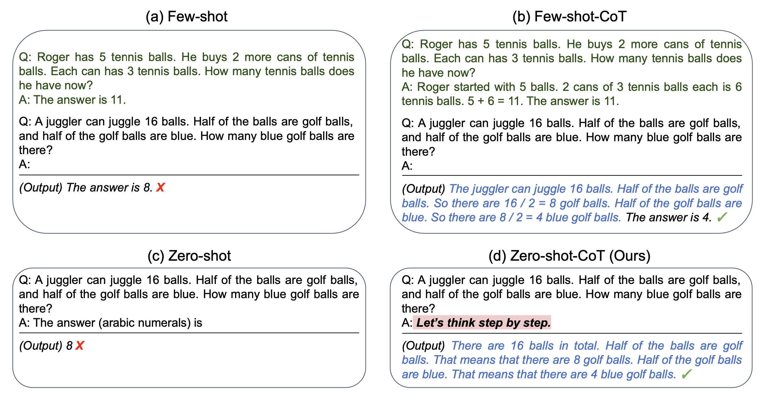 Kojima et al. made a "Zero-Shot CoT" (zero-CoT) prompt to avoid the nuisance of providing several examples for an LLM to learn from. Less effective but easier to implement than standard CoT, Zero-CoT simply appends “Let’s think step by step.” to prompts, encouraging LLMs towards more methodical intermediate step-taking.