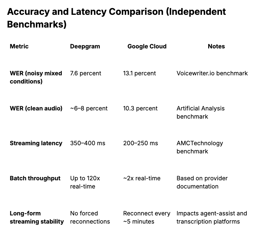 Narrative differences remain essential. Google provides the fastest latency for conversational applications. Deepgram handles noisy, accented, or domain-specific audio more reliably. Customization shifts these numbers in domain-specific workloads, especially in healthcare or technical fields where named entities matter.