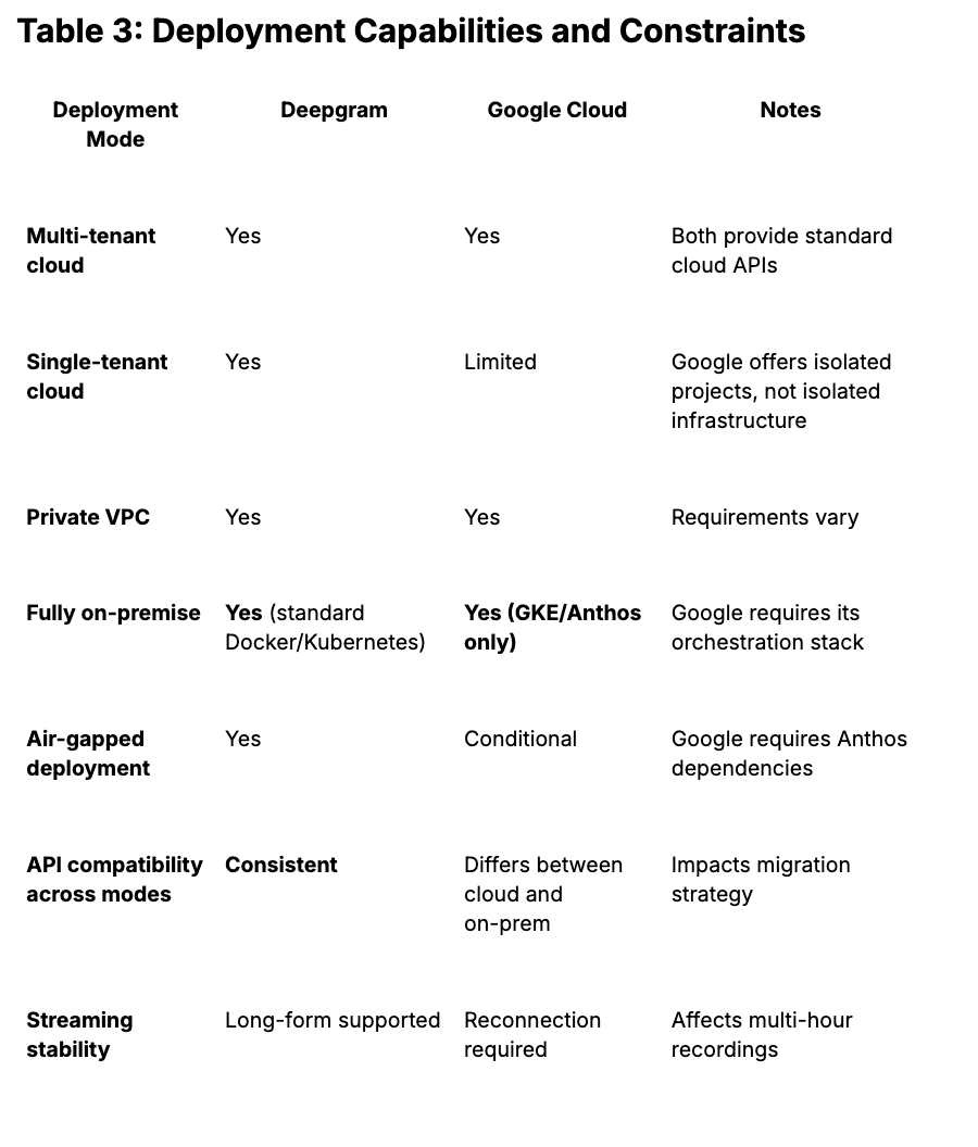 Deepgram’s use of standard Docker/Kubernetes without proprietary layers allows deployments in regulated, air-gapped, or multi-cloud environments. Google’s on-prem option hinges on GKE or Anthos, which introduces ecosystem dependency.