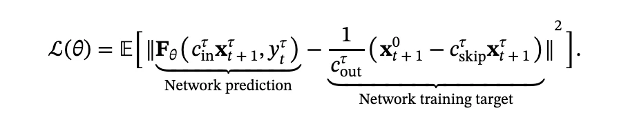 The subtraction (x⁰ₜ₊₁ - cᵗₛₖᵢₚxᵗₜ₊₁) essentially calculates the difference between where we are (our noisy state from the previous step) and where we want to be (the clean state). This difference is what we’re asking our model to predict. It needs to learn how to bridge this gap at each step of the denoising process.