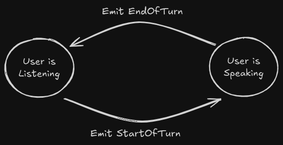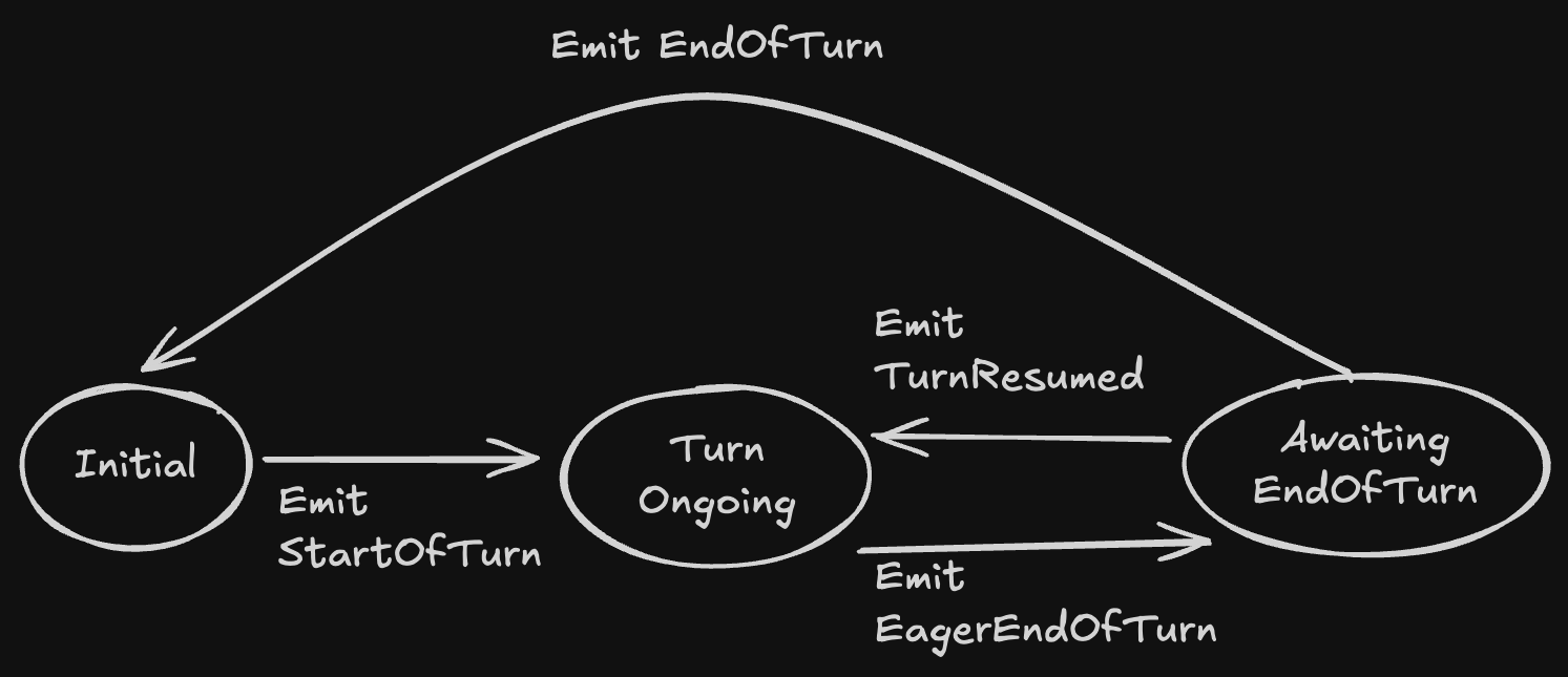 The problem we see with current implementations of state machines is that they are…well…kinda dumb. Or, said more precisely, they lack robustness and consistency, leading to a suboptimal conversational flow, as the result of lack of shared context throughout the conversational model. To be clear, this it not the fault of voice agent developers; they are making great use of the tools they have, just have not always been provided with the correct tools. For example, developers might use a voice activity detector (VAD) like Silero or WebRTC to determine start of speech, a custom turn detector such as Krisp Turn-Taking, Pipecat Smart Turn or LiveKit EOU to determine end of speech, and a speech-to-text (STT) model such as Nova-3 to do the listening for the agent when the user is in the SPEAKING state. With all the different transitions and states modeled independently, it is unsurprising that inconsistencies, delays or just general unnatural behavior can arise! For instance, what should you do when the turn detector outputs an end-of-turn, but the STT model outputs a partial or empty transcript?