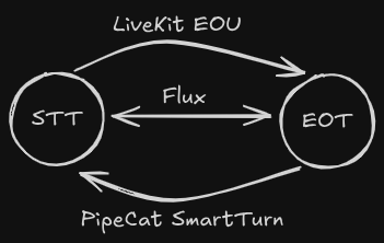 One key decision we made above is draw a distinction between when the user stops speaking (SPEECH_STOPPED) and when they have actually yielded their turn (the EndOfTurn transition). This motivated very much by how humans think during conversations; we are generally thinking of what we want to say next while listening, but that does not mean we immediately blurt it out as soon as the user is finished speaking. While Flux, as an STT model, is not simultaneously thinking of a response, the existence of the SPEECH_STOPPED state allows developers to mimic a human’s ability to be prepared to speak immediately upon EndOfTurn; upon observation of a transition to SPEECH_STOPPED , which we call EagerEndOfTurn , developers can invoke an LLM call to generate a possible response. If EndOfTurn does occur, the response is ready to go, resulting in lower latency and a more natural conversational experience, particularly for use cases where additional work (such as RAG) needs to be done before the response is ready. If the user resumes speaking, as indicated by a TurnResumed event, that response can be discarded in favor of an updated response next time speech stops.