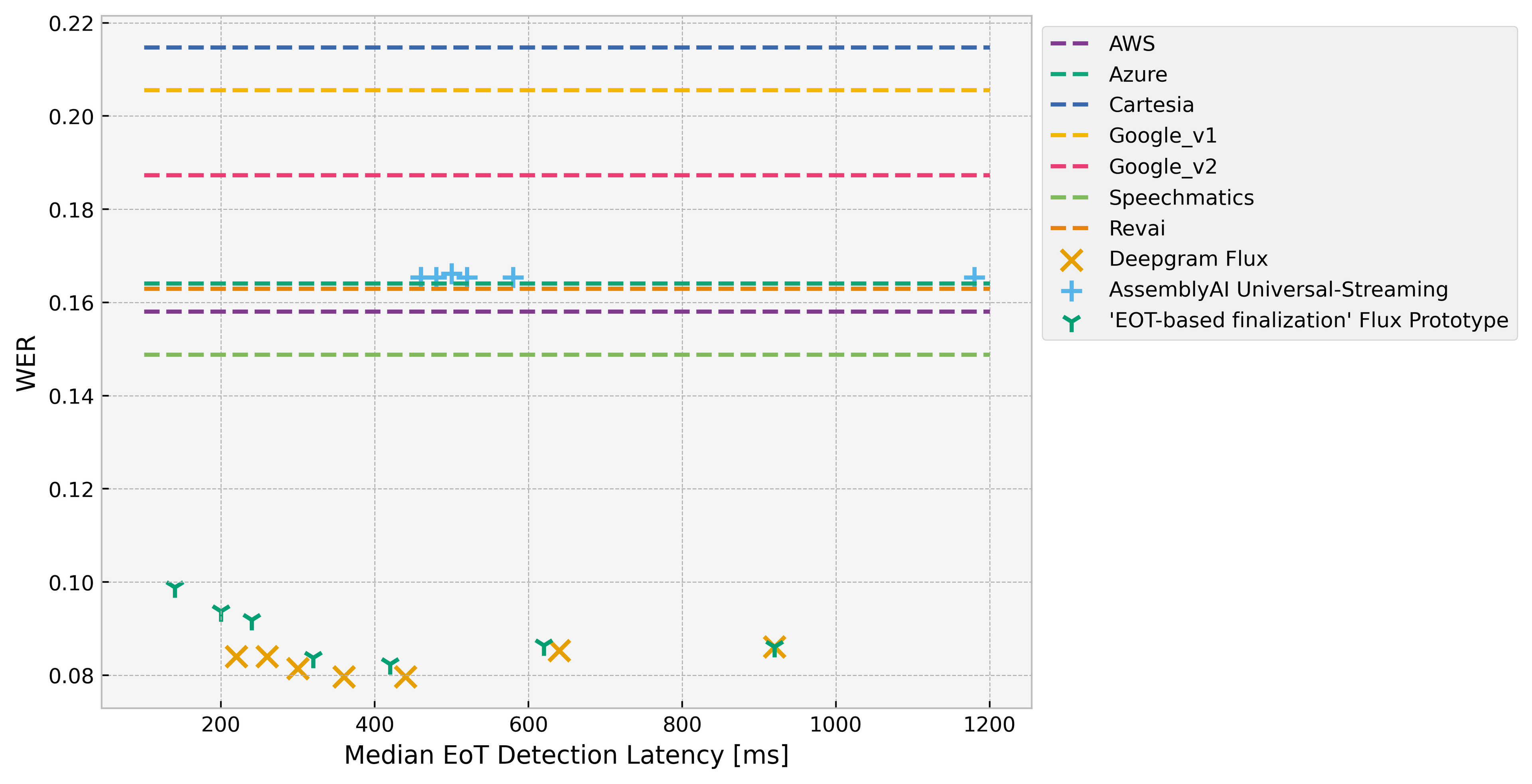 The plot below shows WER as a function of end-of-turn detection latency, as controlled through eot_threshold , evaluated on an internal conversational benchmark dataset. Notably, Flux outputs a consistent, high-quality transcript even as turn detection parameters are tuned, with only a slight degradation at low thresholds. More generally, we found that Flux achieves comparable Word Error Rate (WER) to Nova-3 Streaming, and in particular significantly outperformed competitors on both this conversational dataset and our traditional STT benchmarking sets. Flux also supports keyterm boosting, again achieving comparable performance to Nova-3 on rare but important words.