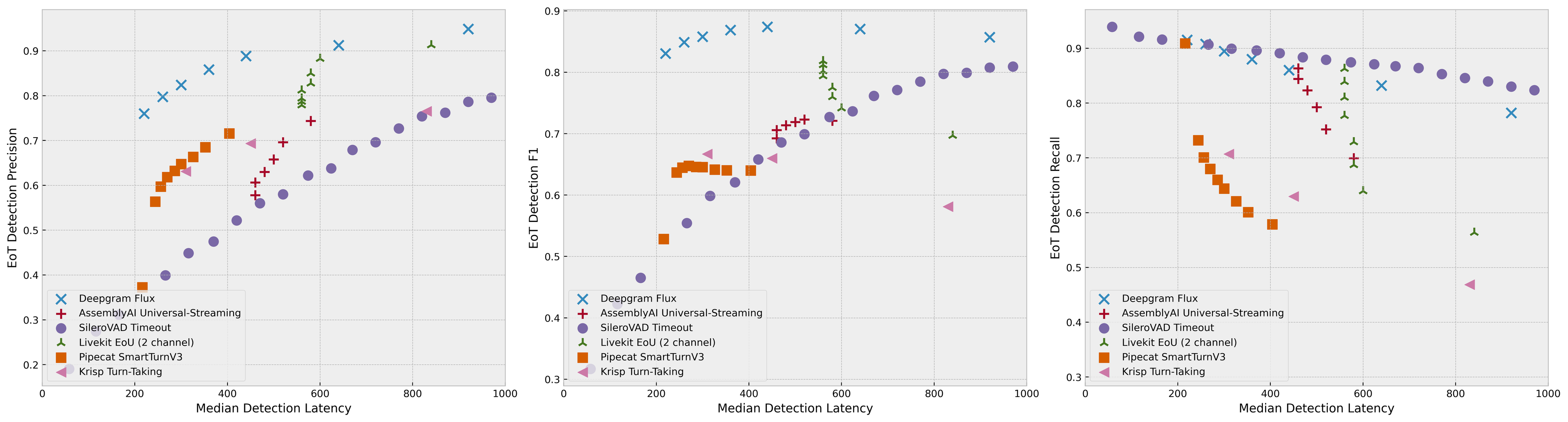 For all models, we define latency as the audio time elapsed after speech stopped for detection to occur, i.e., how much additional audio did the model need to see to correctly detect end-of-turn. This obfuscates additional latency associated with any compute that needs to be done upon detection, but is the best way to be fair given that said compute latency depends on how solutions are orchestrated. For instance, consider a solution where an acoustic-based end-of-turn detection triggers transcription. Such a solution would incur additional latency of t_eot + t_stt, corresponding to the time taken to run the turn detection and transcription models respectively, on top of the values reported in the plots above. In cases where you had to transcribe an entire long turn, t_stt could be substantial. Alternatively, t_stt can be reduced by transcribing the turn in short chunks, such that upon EndOfTurn you only need to transcribe the last chunk, but cutting up the turn may reduce accuracy.