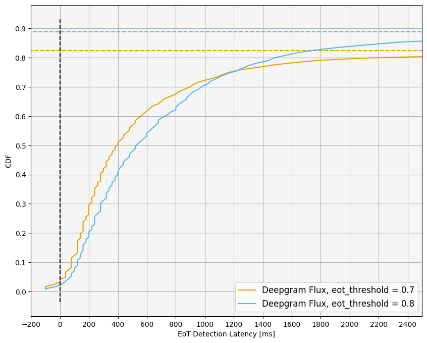 The plot below shows the full latency percentiles for two choices of threshold, eot_threshold = 0.7 and 0.8. To highlight the accuracy impact of increasing the threshold, we treat any false positive detection as having infinite latency. You can see that increasing the threshold adds around 100ms of latency across the distribution, not just as the median, but in exchange for a ~10% increase in overall precision.