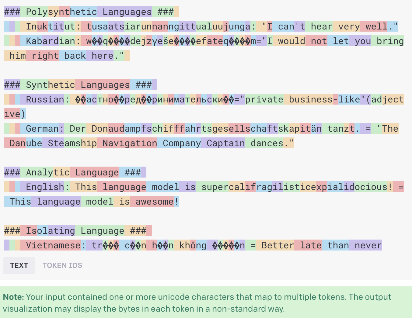 Notice how languages with different morphological structures tend to have different token lengths on average (e.g., English averages a few tokens per word while a single Inuktitut word is divided into 13 pieces). With this small sample size, we get a glimpse at the sub-word tokenization differences across language types, but others have more definitively tested what we see above.
