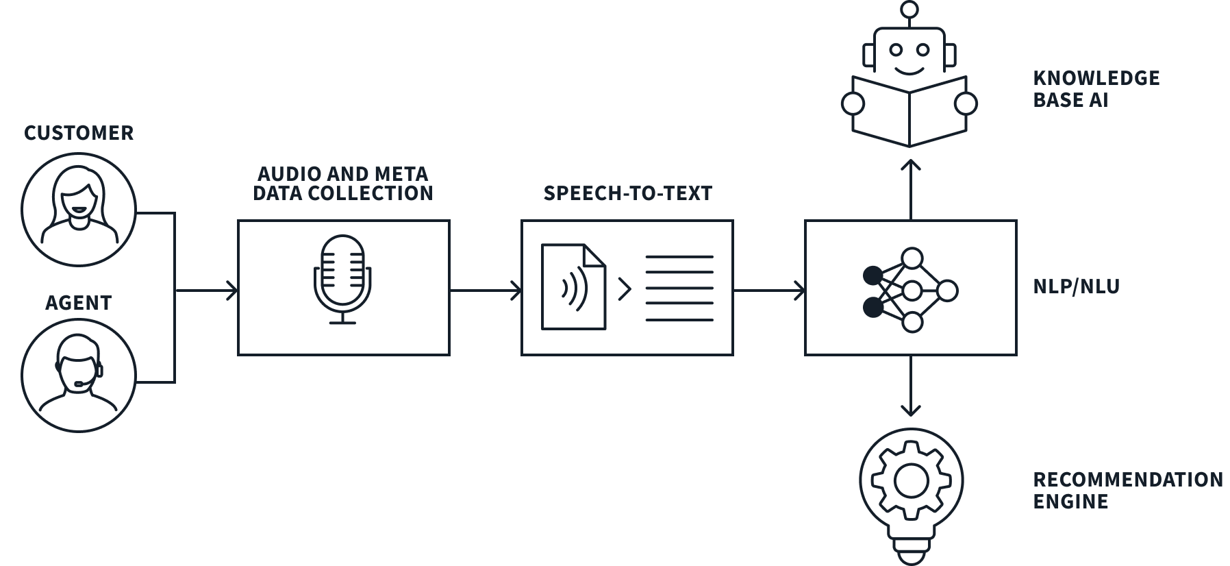 This process starts with recording and collecting the audio from both the customer and the agent, normally on two channels, and sending it to a speech-to-text solution that converts the audio to text. The speech-to-text platform may also send other metadata to help the Natural Language Processing/Understanding solution determine the intent of the conversation. NLP/NLU solutions take the text and try to find the intent of the conversation and sentiment.