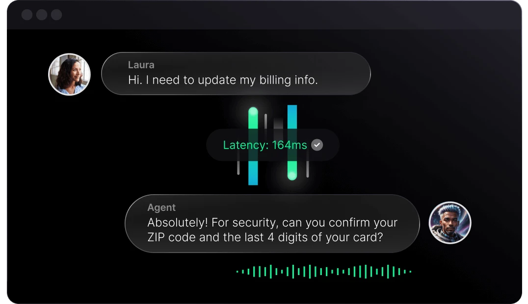 Conversational AI agents are only as good as their ability to respond instantly. Delays break the flow, frustrate users, and reduce trust. Deepgram’s streaming architecture delivers sub-second round-trip latency across speech-to-text and text-to-speech, keeping your voice agents natural, responsive, and humanlike even at scale.